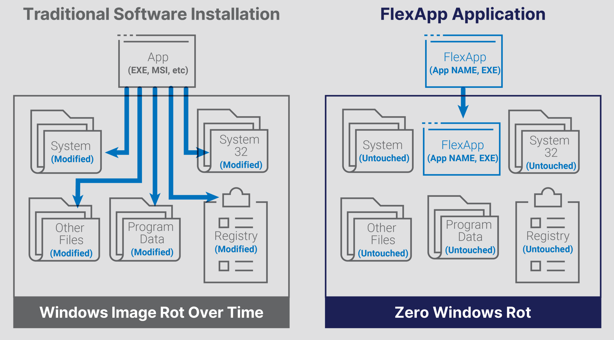 FlexApp attaches applications at boot, login, or on-demand — improving performance, reducing image sprawl, and supporting complex apps.